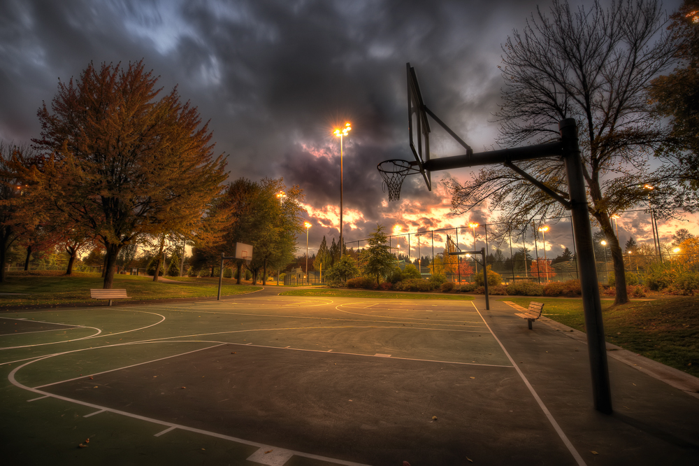 The park is really beautiful with loads of trees covered in red and yellow leaves but they were blocking out the sky, and really that’s what I wanted to shoot. I tried loads of different compositions and got some great shots, but not the one I was really after. Walking back to the car, I came to the basketball courts and they looked great. The courts were empty (it was about to rain and everyone had gone home) and it had got even darker, the sun was nearly over the horizon and the sky in the distance was red.