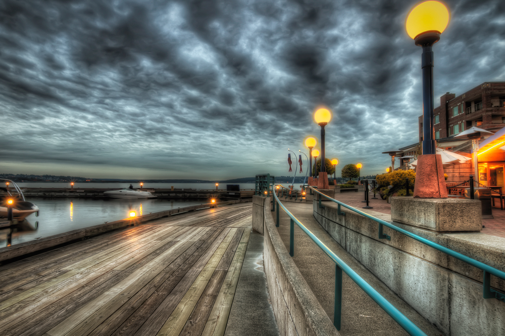 Tonights picture is a great example of this. I shot the image at Carillon Point in Kirkland as the sun was going down. Earlier in the day the clouds were pretty flat and boring, but once the sun was low in the sky the clouds took on a much more interesting look. Luckily when I set up the tripod for this image nobody was around (that usually never happens) so I didn’t have to take anyone out in Photoshop.