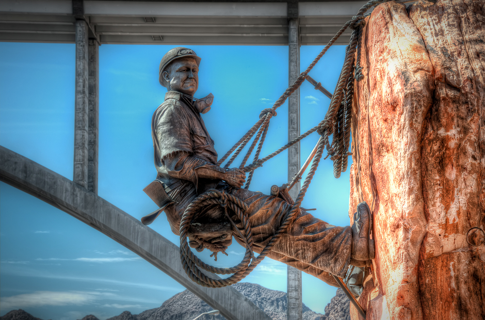 Tonight’s picture captures another sculpture from Hoover Dam. This piece of art work is pretty new though, the piece was commissioned in 1998 and depicts one of the most dangerous jobs required to build the dam. The job is called a High Scaler and involves sitting in a little “bosun’s chair” and being suspended hundreds of feet in the air and setting charges into the face of the canyon’s walls to remove lose rock! The status is based on Joe Kine who carried out this job for a few large dams in the 1930s and 1940s. The monument is dedicated to the 98 men who lost their life during the dams construction and actually sits on the visitors car park.