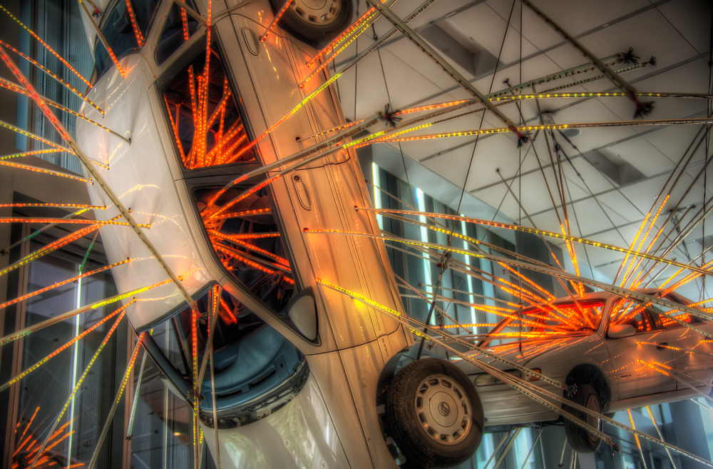 I should say here that while the weather started off wet, once the walking tour started everything dried up and even the sun came out. So it was a complete success. I have loads of cool images to post, but Abi selected tonight’s shot. We checked out the entrance of the city Art Museum while on the tour and they had these amazing cars hanging from the ceiling with neon (or LED, not sure) lights coming out of the cars. It was very “arty” and looked fantastic! I took loads of shots and selected this one as my favorite to post. I think there were five cars in total, here I’m catching two of them. The problem was, the lights kept blinking on and off and timing it right to get the picture below took a long time. In the end I just held the shutter down to get the lights right and the result was great.