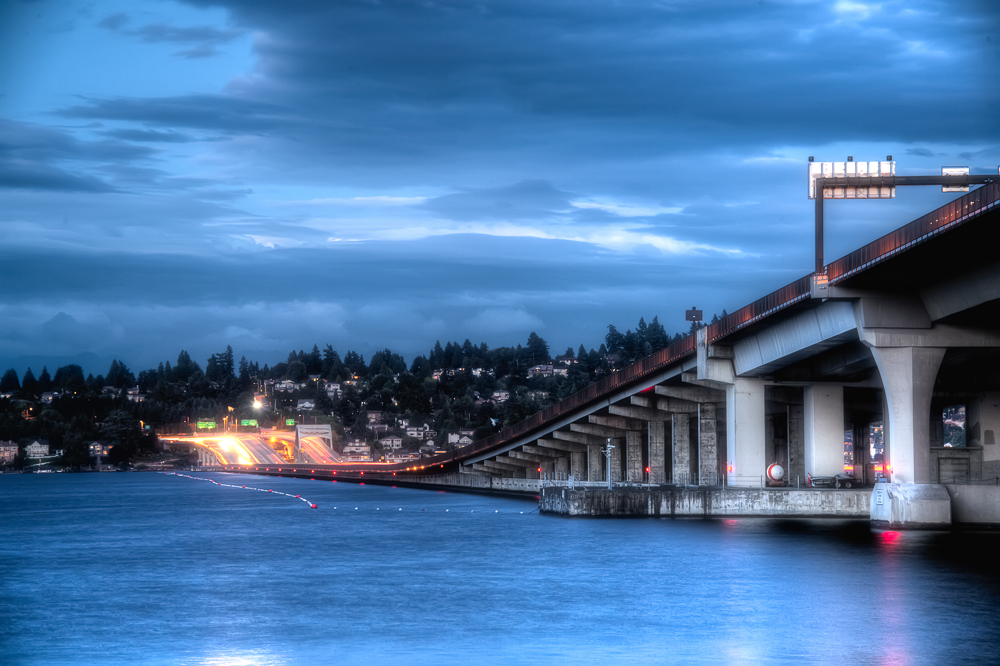 I was driving sown Lake Washington Boulevard and I saw the I90 Bridge all lit up. It was pretty dark by this time so they had these red lights along the bridge, and loads of traffic headlights and stop lights on the bridge itself.