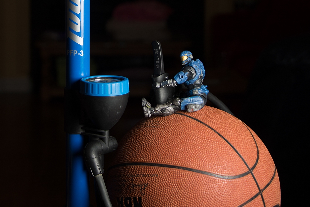 Carter wanted to play basketball this evening but the ball was flat, so he helped pump it up.