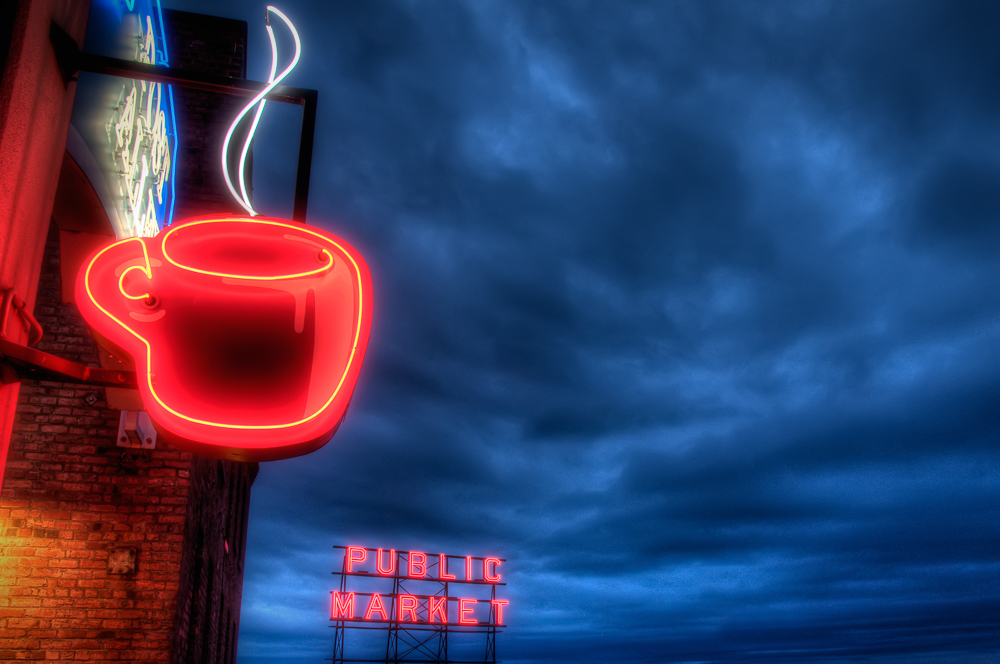 Anyway, I had to go to work today and I was looking for something I could shoot tomorrow. So I put “Seattle” into Bing and loads of really nice images popped up. A few times the image of the coffee cup outside Post Alley appeared. It would seem that this neon cup is kind of a Seattle iconic image. Anyway I looked at the pictures and thought “I’m sure I captured that”. So when I got home I looked in my back-log and sure enough I have the picture.
