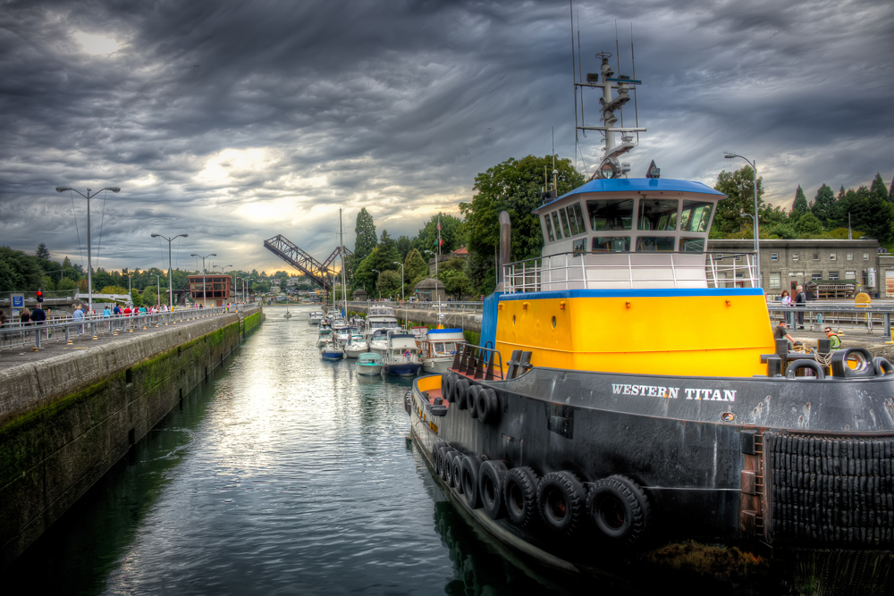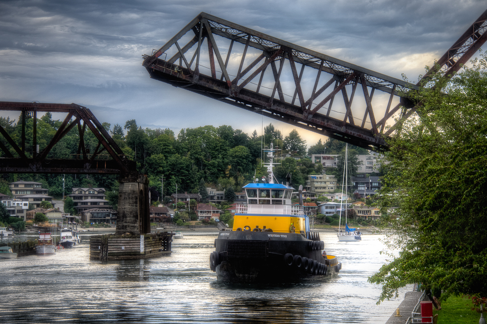 In yesterday’s posting I told you about visiting Ballard Locks in Seattle – I was lucky enough to get a few good shots and today’s posting is another one from the visit. Yesterday’s tug boat entered the lock from Lake Union and to get out of the Lake and into the lock it had to get past the Ballard railway bridge. I was there at exactly the right time to shoot the boat as the bridge raised and the tug boat sailed underneath.
