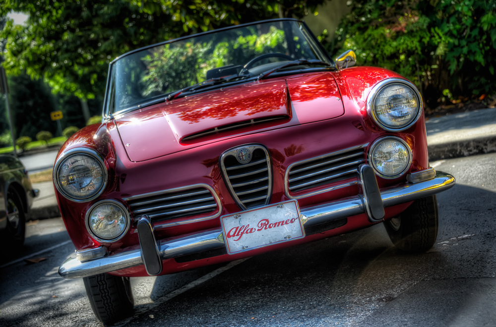 So here I was at the Redmond Exotics Car show and I found this bright red Alfa with nobody around it. The bodywork color just popped against the green bushes and trees behind, so I jumped at a shot. To try and get over the terrible lighting conditions, I took 5 bracketed pictures each one with a different exposure. Then I HDR’d the images together in Photomatix to get the picture below.