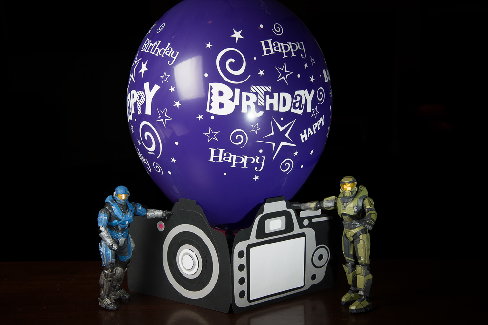 Here we have Carter and Master Chief posing by my cool birthday card (of a camera) – made by Lisa, and a birthday balloon.