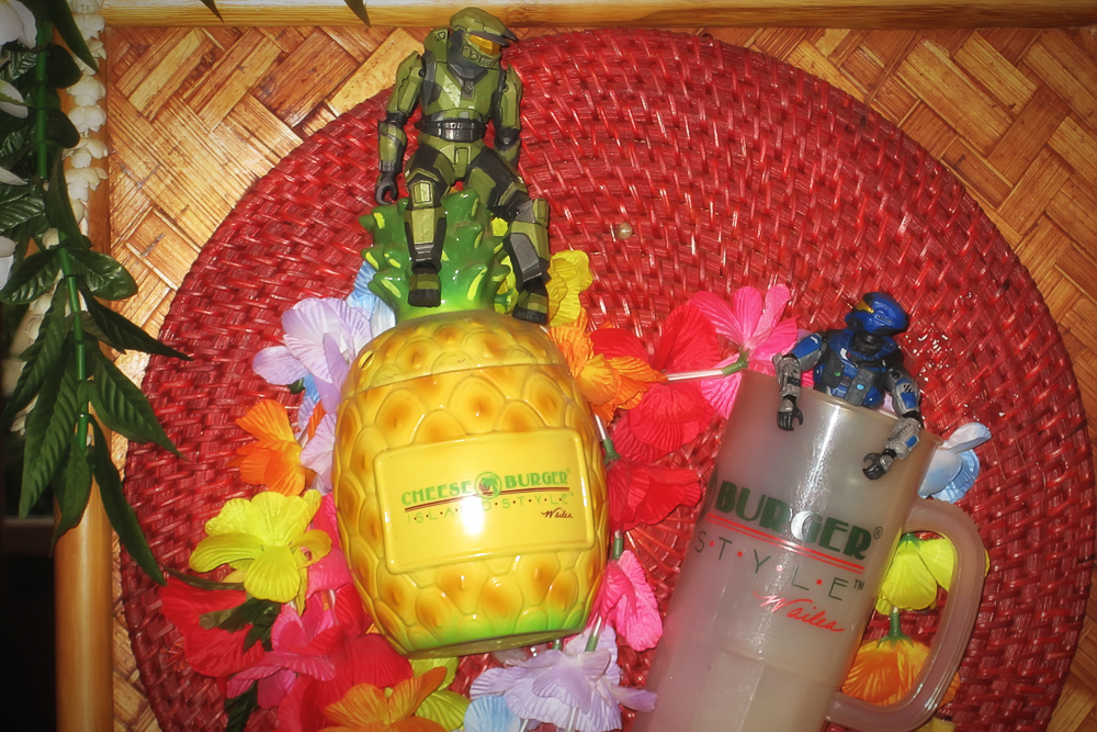Tonight we went to the Cheeseburger Island Style restaurant in Wailea, but we lost the Halo guys, then I found them playing on the wall decorations!