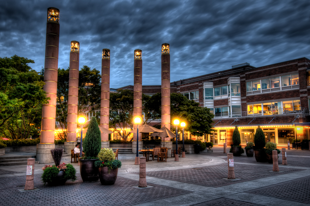 Around the outside of the roundabout are a number of restaurants, shops and, of course, the hotel. You can’t actually see the hotel in the shot below (it’s to the left of the image), but you can see the restaurants and bars lit up. It’s actually a really nice quiet place to hang out (if it’s a nice evening). You can enjoy a lovely meal while watching the sun set over Lake Washington (that was behind me when I took the shot).