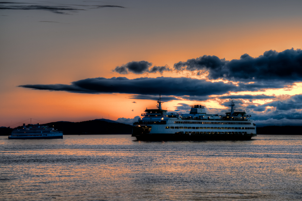 Tonight I’m posting another image from last nights visit to Seattle. Shortly after I got there I caught a ferry coming in as another was going out. The sun was really over the Olympics mountain range but the sky was a great orange, red color.