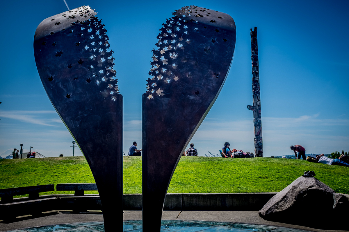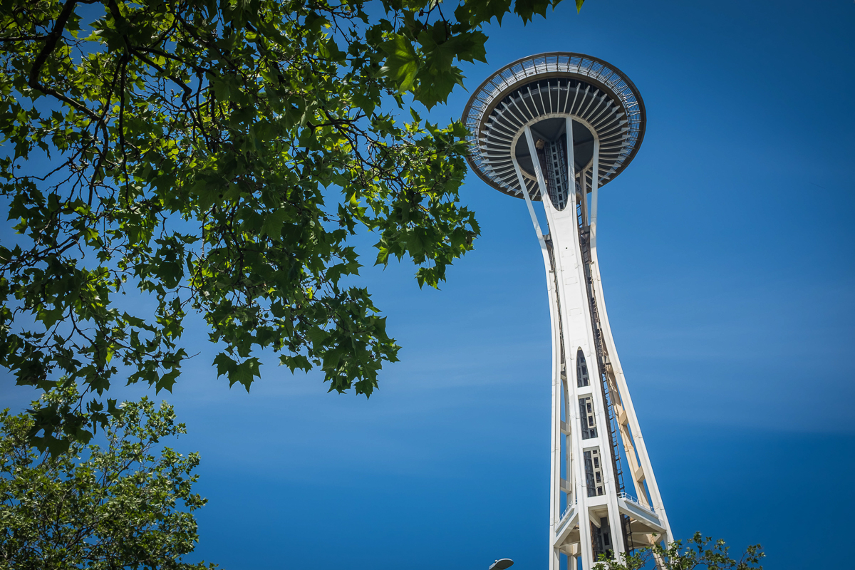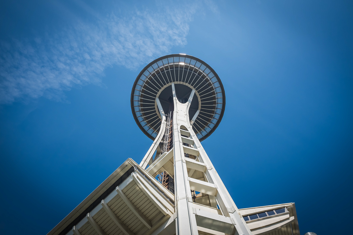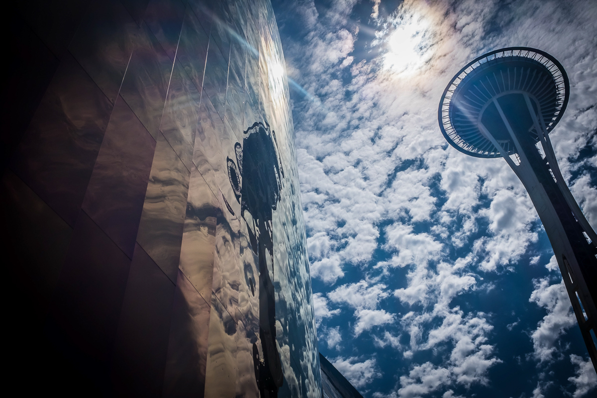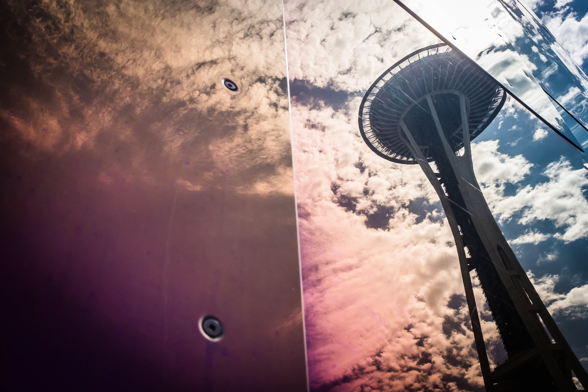Then it was onto the Space Needle. Now I’ve taken so many pictures of the Needle it’s difficult to come up with something new or interesting. I got one shot I quite liked standing below the needle looking up and a couple of others getting the needles reflection in the “Experience Music Project” (EMP) building.