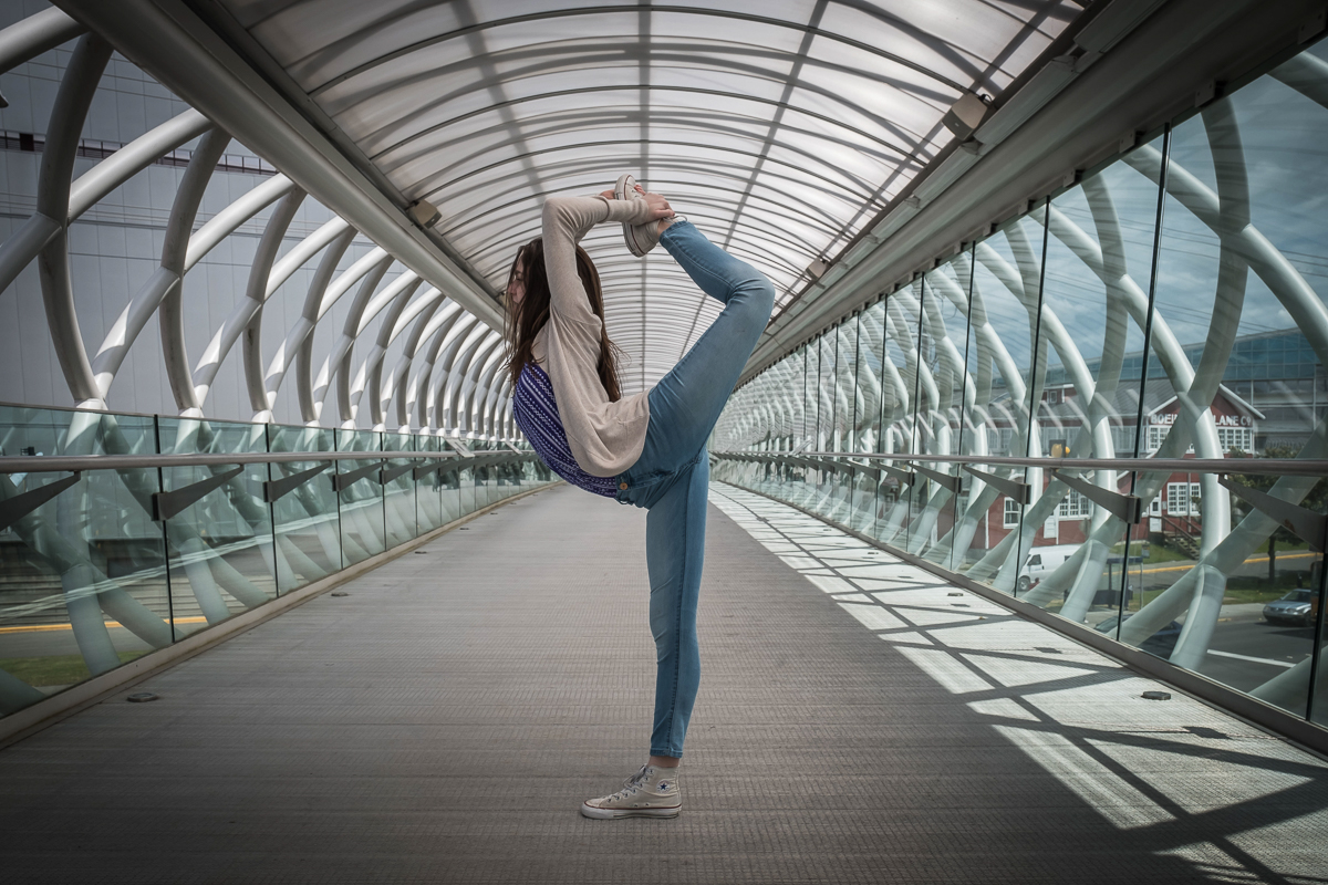 They also have a great bridge that spans the major road by the Museum, that links some of the buildings together, and while on the bridge Abi did one of her cheer moves (called a Scorpion I think) so I shot that and like the image with the bridge disappearing behind her – so at least that’s a new pic.