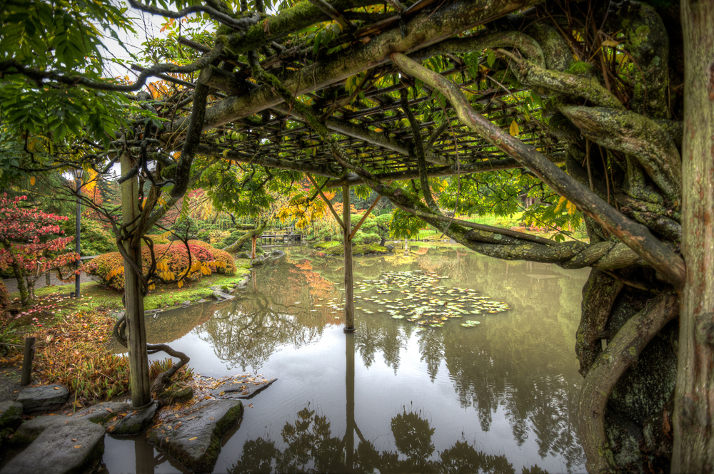 Today’s image was again taken at the Japanese Gardens in Seattle. I was walking around the lake looking for interesting subjects and I came across this rickety gazebo built against a tree and standing in the water.