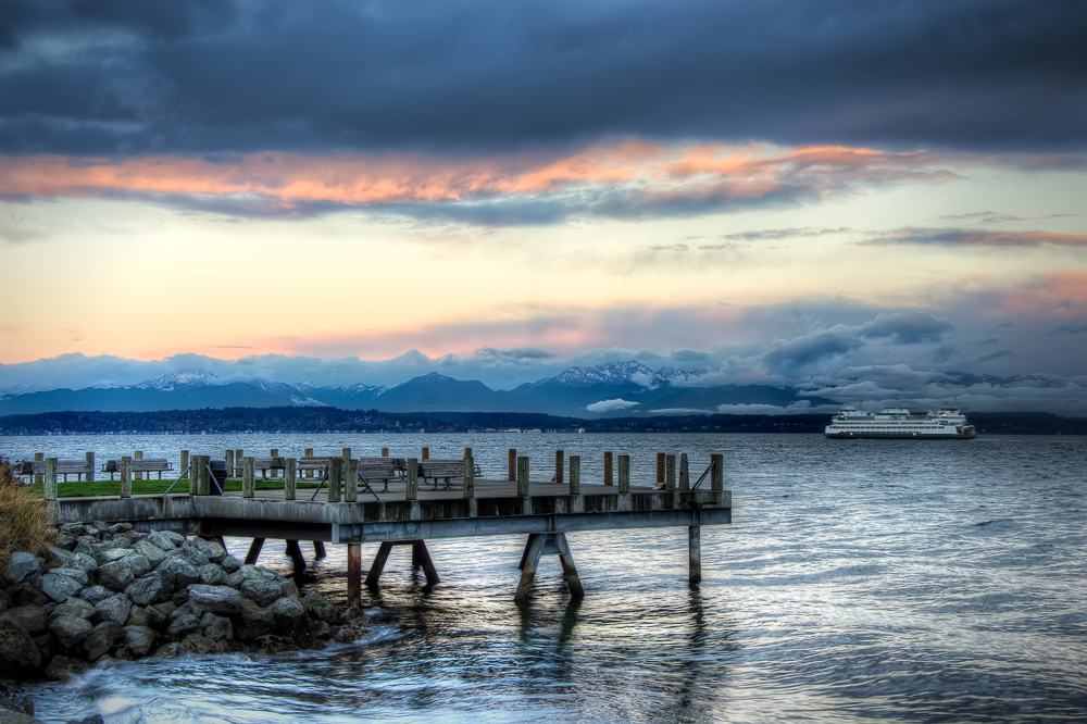 Tonight I’m taking you back to sunrise at Alki. The sky was really pretty and we had taken loads of pictures of the cityscape I was looking for something different. Just further up the beach was this little pier hanging out over Elliott Bay. There were actually a few people standing on the pier when I took this and they kind-a ruined the picture. So I hit Photoshop and now they’re gone.