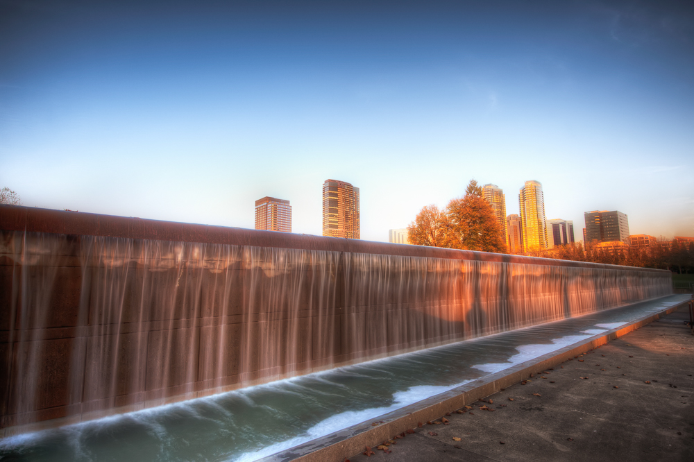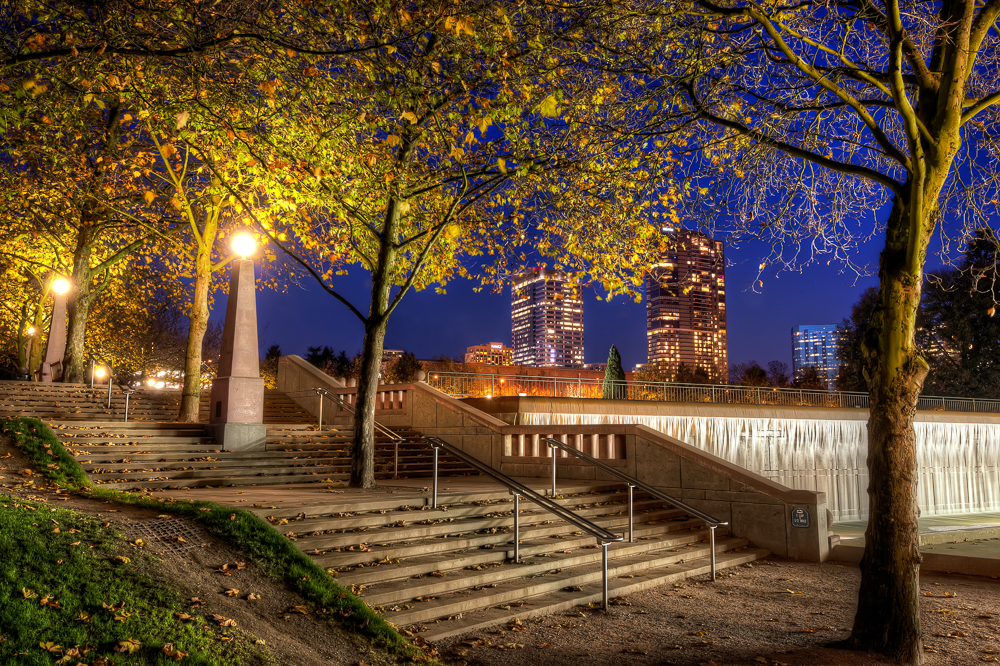 Anyway, back to the park. The park is basically a large expanse of grass surrounded by a walking path that’s lit up with stone lamps. There’s also a number of water features around the paths, and at one end is this pretty cool really wide waterfall. Around Thanksgiving the city of Bellevue also open up an ice skating rink right by the waterfall and when I was there they were setting it all up.