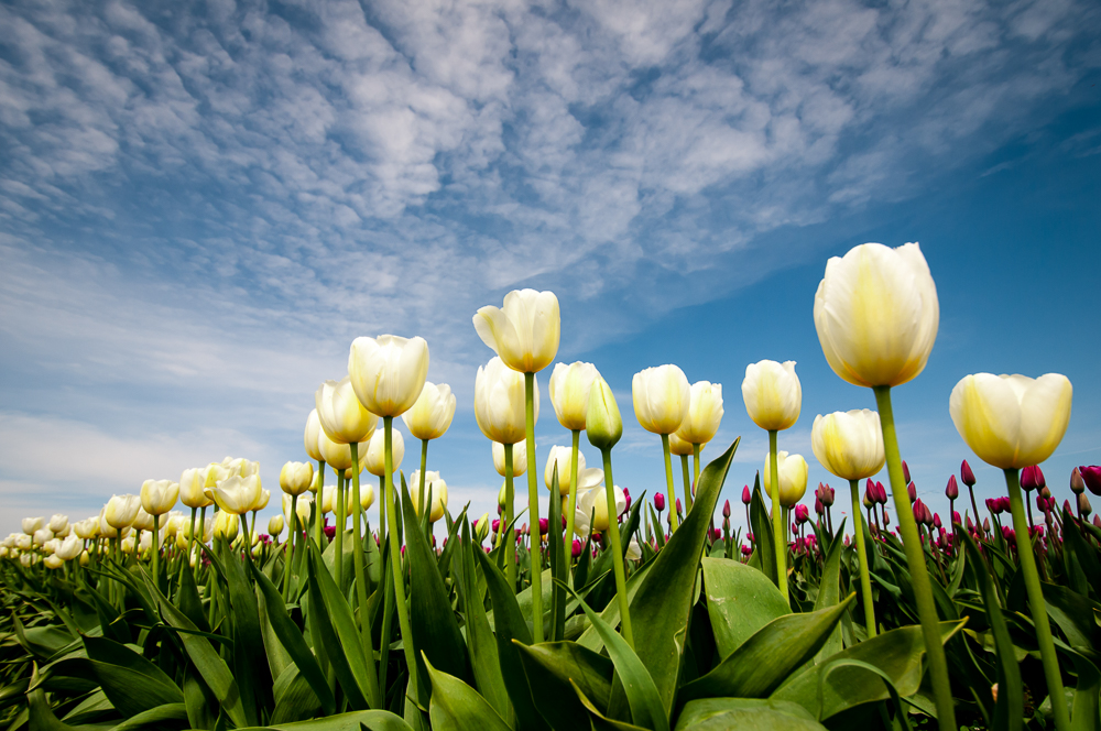 I wanted a shot of a tulip row disappearing off into the distance with a nice sky above. This is what I got. The dark pink tulips behind added to the image by making the white ones stand out a little.