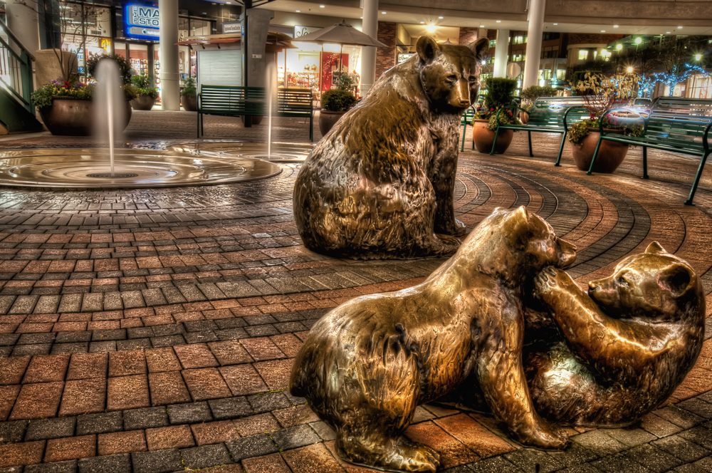 In the middle of Redmond Town Center is this seating area that surrounds a couple of fountains. On the brick tiled flooring are three bear statues. I took this picture quite late at night and nobody was around (no security guards either). I wanted to bring out the texture in the brick floor and statues so this is an HDR image (what a surprise).