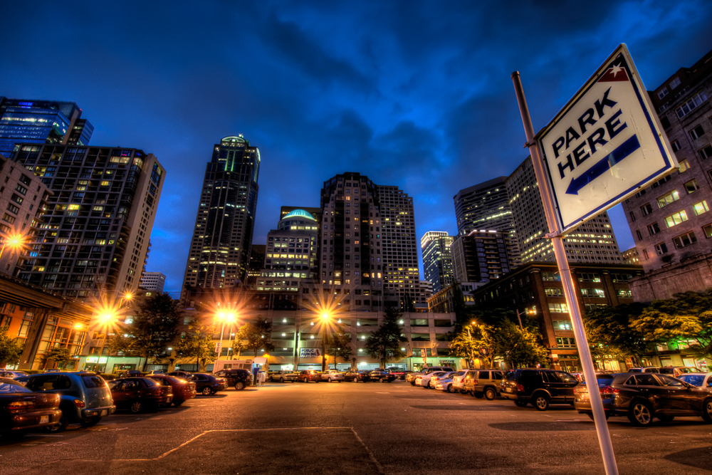 Across the road from the waterfront is the Seattle Alaskan Way Viaduct. This carries the SR 99 from north to south Seattle and is soon going to be torn down. Under the viaduct (or really just past under the viaduct) is a car park. I pulled in, to park the car so I could go and shoot the piers and thought the city buildings looked great. So I grabbed this shot. As it was pretty late there weren’t too many people walking around but as you can see there were still some cars left.