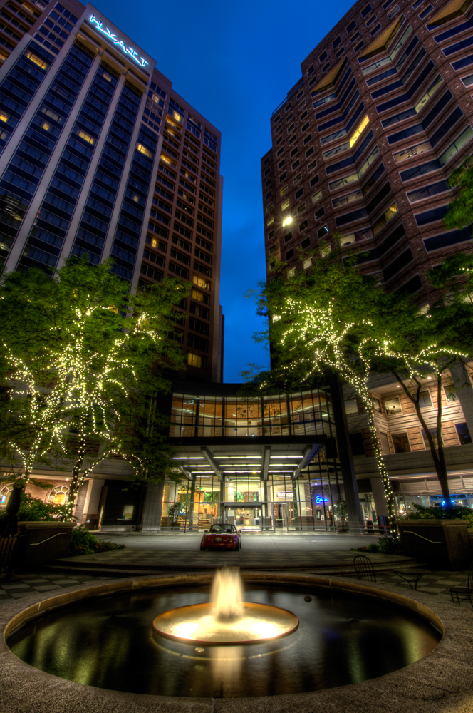 So what about this picture? Well I took this shot around 9:30pm and it was quite dark outside. I placed the camera on a tripod in front of the fountain and used a long exposure. That brought out the blue in the dark sky, almost making it look like day time. I loved the little fountain and thought it would provide some foreground interest to the image, but I had to take loads of pictures as people kept driving up to valet park their cars, so this was the best of a number of attempts.