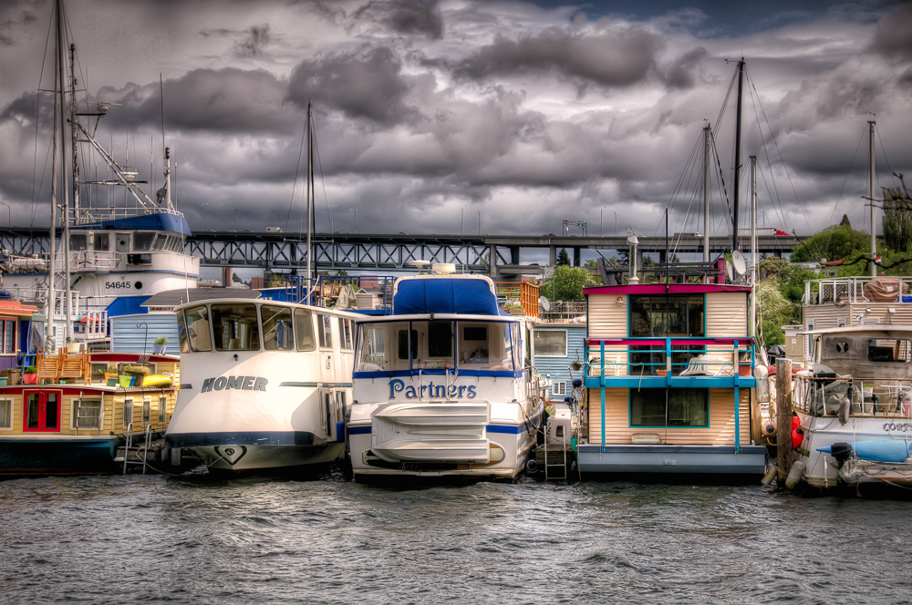 The Bridge you can see behind the houseboats and below the clouds is the George Washington Memorial Bridge (or more commonly called the Aurora Bridge). This is a huge cantilever bridge that links the Queen Anne and Fremont districts of Seattle together. It’s actually a very cool bridge in it’s own right so well worth another visit for a future picture of the day.