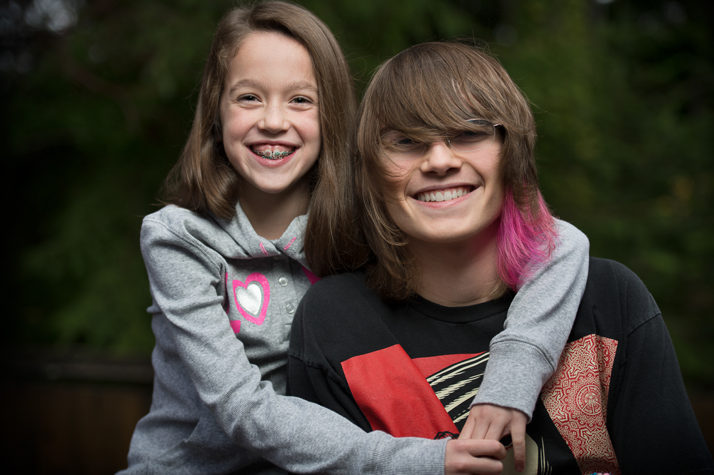 I kind’a like taking pictures outside, we have a lot of trees behind our house and they provide a nice backdrop when they are just out of focus. I really wanted the kids to be brighter than the trees so I used a single speedlight flash in a 24″ softbox. I dialed down the exposure until I caught some of the background in the image (it’s a little dark but you can kind of see it’s trees) and used the light to make the kids faces pop. The end result was pretty good and even James liked them and he’s hard to please. In fact he’s asked me to take some pictures of him and his girlfriend Alex, so all in all a major success.