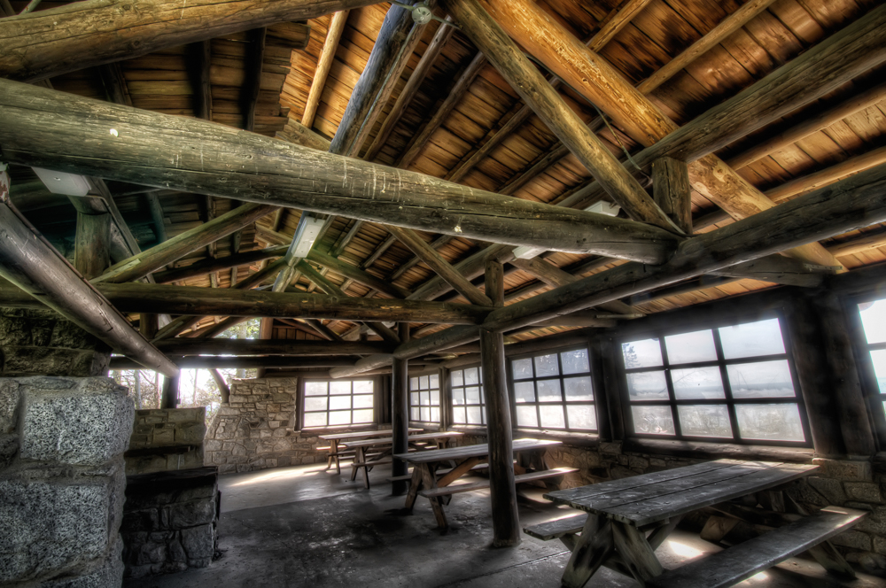 The building was made up of large wooden logs and there was a rustic slightly weathered look to the interior. There was a lot of sunlight streaming in the the window and a stone floor and fireplace. I figured it would make a good HDR image as it was really dark in the roof and corners and very light by the windows.