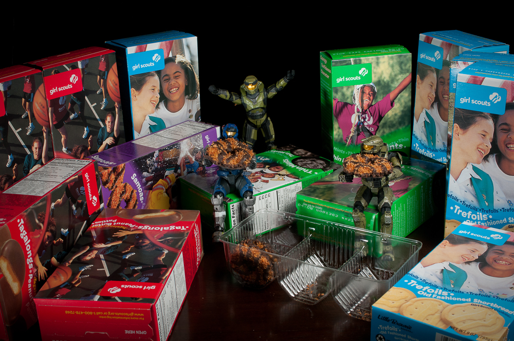 Lisa collected 50 boxes of girl scout cookies today. Then all day we had people coming by to pick up their orders. It appears that the Halo guys stole their own stash, this is what I found them doing this evening.
