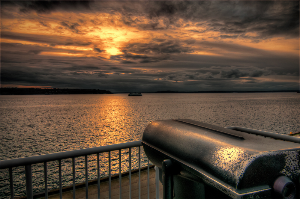 I captured this image yesterday from the observation roof of the cruise terminal in Seattle. The view is overlooking Elliott Bay as the sun sets. You can see a ferry coming in in the center of the picture, I’m not sure where it’s coming from but it’s either Bainbridge Island or Bremerton.