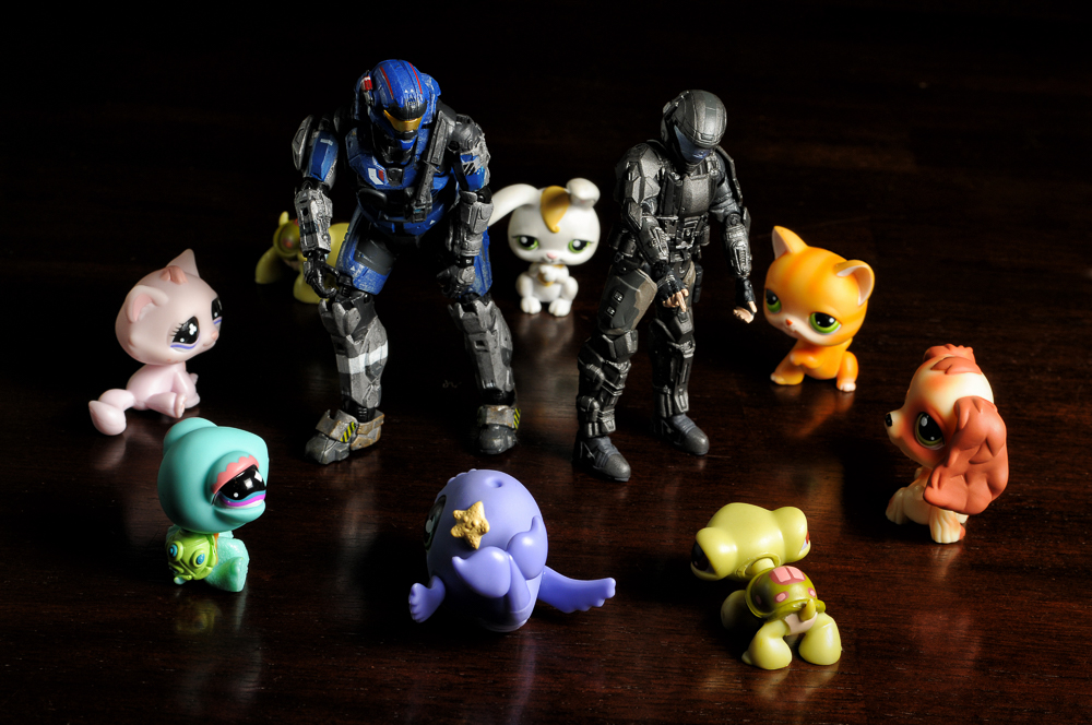 Abi has hundreds of these “Littlest Pet Shop” Toys (and I mean hundreds) here they ganged up on our Halo heroes.