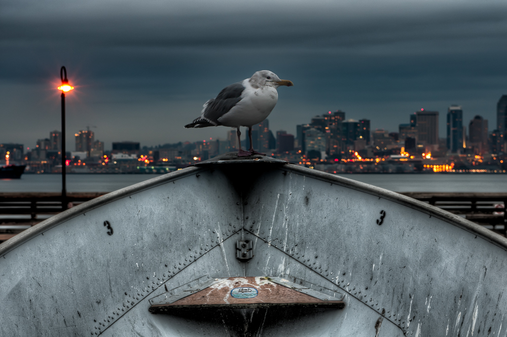 I went out with the camera today to see what I could capture but it was a bit miserable again. Rain with grey skies. Anyway I went over to west Seattle to Alki Beach and found this pier with some boats propped up on the railings. Sitting on the top of one of the boats was this seagull.