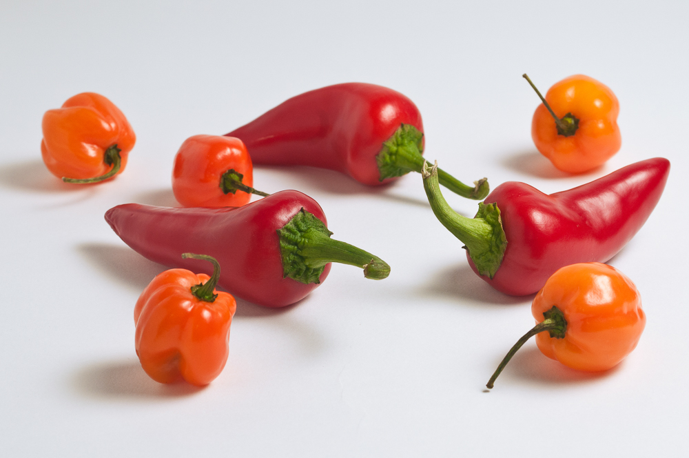 Anyway, for tonight I thought I’d try food photography. Never tried this before so this is a complete experiment. I didn’t know what I wanted to shoot so I went to QFC and walked around with a basket looking for something interesting. Oh sure I brought fruit (every kind of berry) but I was still looking for something new. Then I found these peppers. I immediately thought they would look great on white paper (loved the red and orange colors) so I grabbed a handful and rushed home.