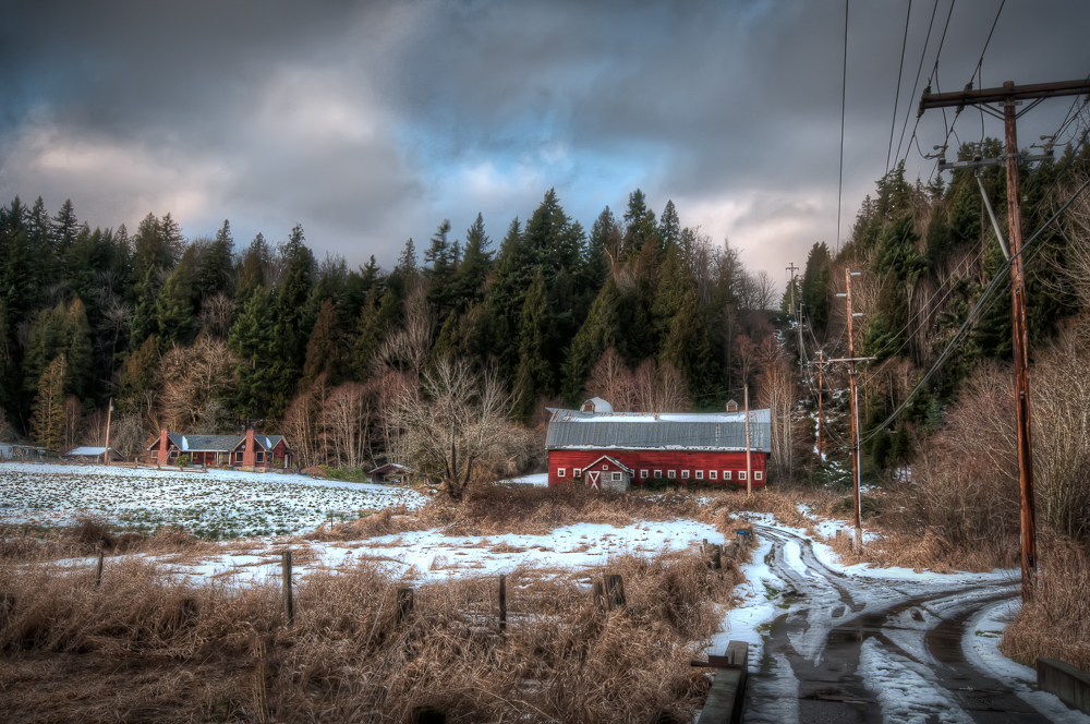 This Red Barn is in the Redmond to Fall City road and I’ve driven past it hundreds of times. As there was a little snow left on the ground I thought I’d catch this shot as with the white field, red barn, evergreen trees and bit of blue sky poking through it looked good. I also liked the road leading you to the barn. Some will say that the telegraph poles and lines are a distraction (they usually are) but for some reason I like them here in this shot too.