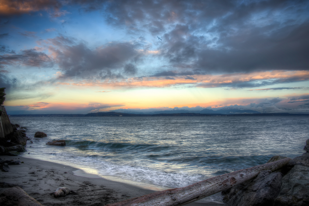 A couple of weeks ago I went to Alki Beach over in west Seattle to see a sunrise. I had to get up at the crack of dawn (that’s 6am) on a Saturday morning to get the pictures. While I was there I walked down to the beach and got this shot. I really wanted to get an image lower down with the sun on the horizon and the waves lapping against the beach. So I’m down there snapping away and after a few shots I check out the images on the back of the camera.