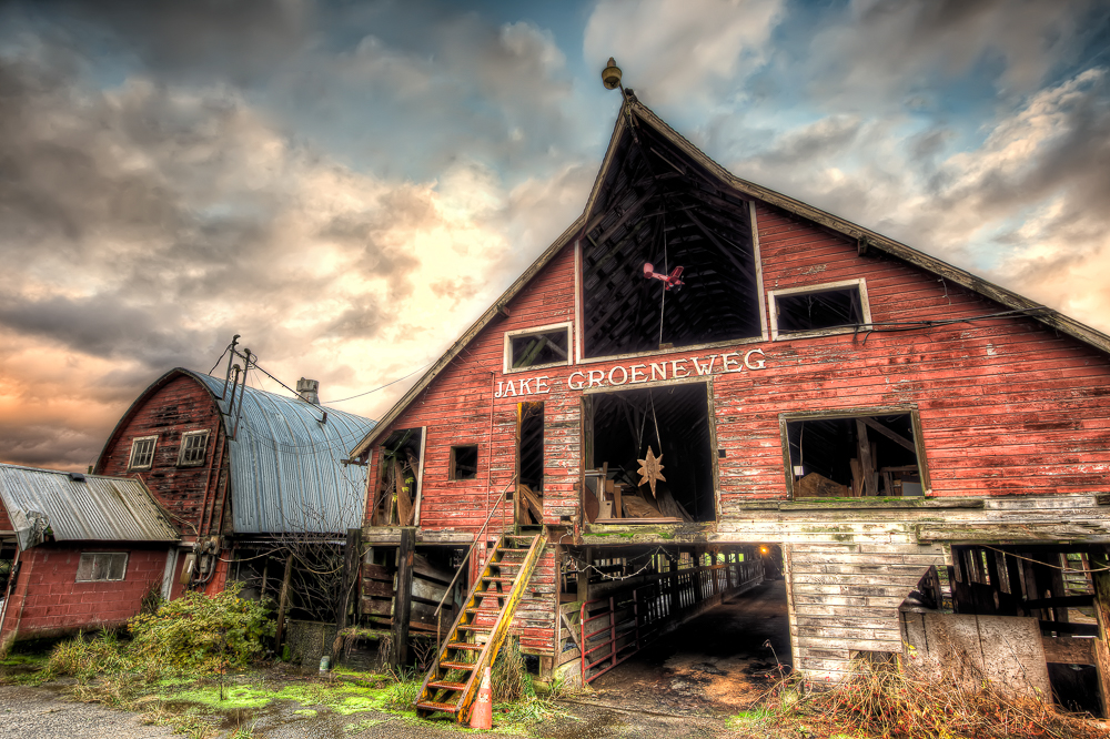 The barn had a load of cables coming off the roof and they really ruined the image. So I took all those out in post processing. I also tone mapped the image to bring out some of the shaded areas and give the sky a little drama and ended up with the image below. Oh there was also a huge tire in the bottom right hand corner that was just distracting, so I took that out too. Pretty pleased with the end result though.