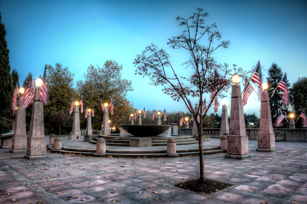 The Bellevue Downtown Park is right next to Bell Square Mall – which by the way if you haven’t visited is a pretty impressive shopping mall, just ask Lisa! Just by the Mall where the part starts is this large fountain surrounded by lamps. I have no idea if it’s here to signify anything but it’s covered in flags. I was there for the sunset and took this image just before the sun went down.